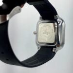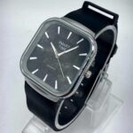 *Product Description*: Movement: Quartz Case Shape: Square with rounded corners Case Color: Silver-tone (Polished Metal) Dial Color: Black with radiating pattern Strap Material: Black Rubber/Silicone Style: Modern, Casual, Formal